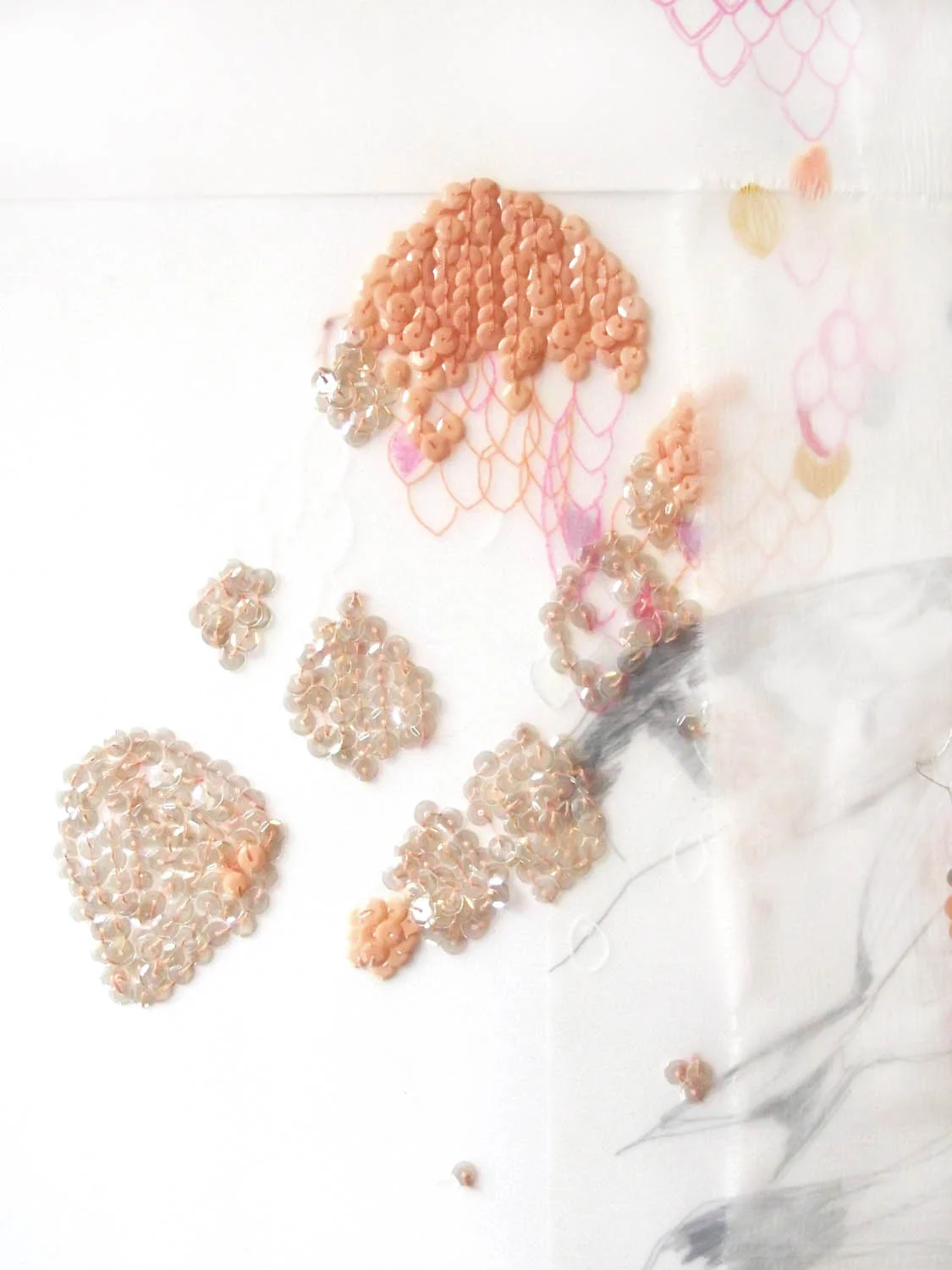 The fish scales as the fish themselves are reminded in these illustrations and embroideries by a play of layering of transparencies, sparkling and pearly details. This project intends to underline the precious aspect of fish skin through a blend of colours, materials and different textures. The embroidery superimposes the drawings like a kind of second skin, where patterns of scales overlap to create relief.